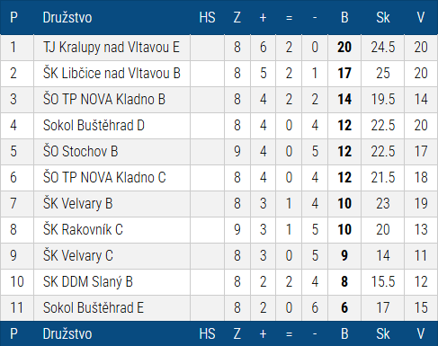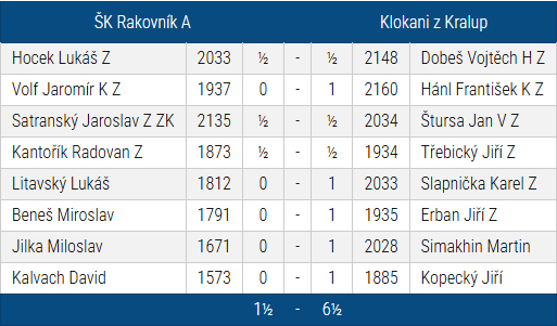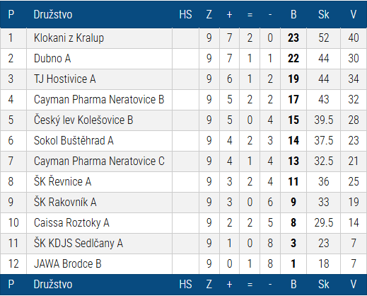 Kralupští Klokani zvítězili v 9.kole Krajské soutěže ´A´ nad týmem ŠK Rakovník A vysoko 6,5-1,5. 2.kola před koncem soutěže jsou Klokani na prvním místě tabulky a budou bojovat o postup do vyšší soutěže.